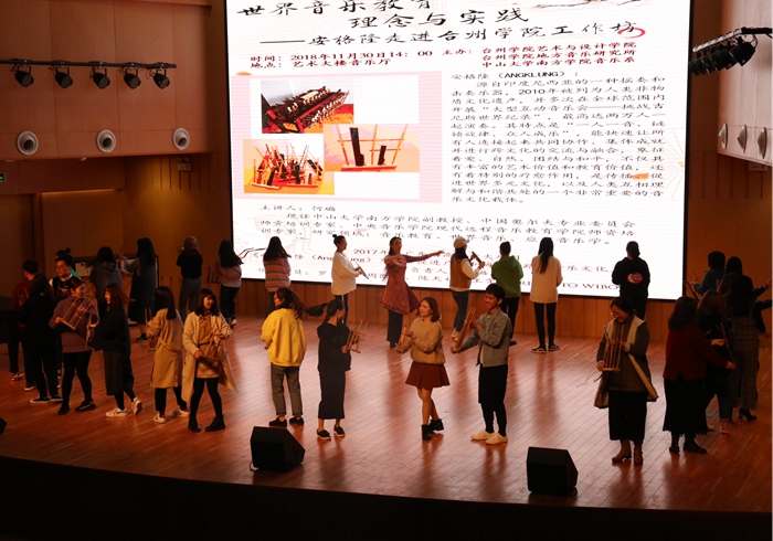 安格隆是源自于印度尼西亚的一种摇奏和击奏乐器,其特点是“一人一音、链锁旋律、众人成乐”,能快速让所有人连接起来共同协作、集体成就并进行跨文化的交流与融合。在对安格隆这种乐器进行介绍后,何璐副教授便开始了现场实践教学环节。何璐邀请现场的同学上台尝试安格隆,亲身体验这种乐器的演奏方式以及由它带来的乐趣。何璐提倡达尔克罗兹的教学方法,认为人是通过自身的运动将内心的情绪转译为音乐的,人体本身就是乐器。因此,在对员工进行音乐训练时,只训练耳朵、嗓音、手指是不够的,必须要练好体态、姿势及各种形体动作,要启发员工们进入乐曲的激情中去,把乐曲的感情化为具体的动作、节奏和声音,以达到唤醒天生的本能,培养节奏感,构建身心和谐,使感情更加细腻敏锐。她一直在舞台上与同学们互动,用音乐做游戏,用乐器来表现律动的美丽。同学们在她的带领下深深陶醉于旋律之中,在音乐中舒展身体,自在呼吸,不拘泥于技巧,从情感出发表达和感受一段优美的曲子。在何璐老师指挥下,同学们即兴谱曲,集体演奏,成功地用安格隆演奏了《月亮代表我的心》来圆满收尾。