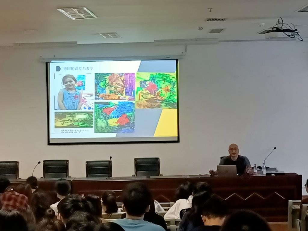 会后,何峰教研员做了《美美与共——教与学的理解与把握》的精彩报告。何老师从四个方面进行具体讲述:一是好教师是如何教学的;二是什么是优课——教学设计;三是教育实习的各环节实施过程和注意事项;四是美术教学中的“潜规则”。何老师以其丰富的教学经验和形象的案例,为同学们从心理上和业务上做了一次实习工作的梳理,使同学们更加明确了实习的流程和实习中可运用的创新性技巧。