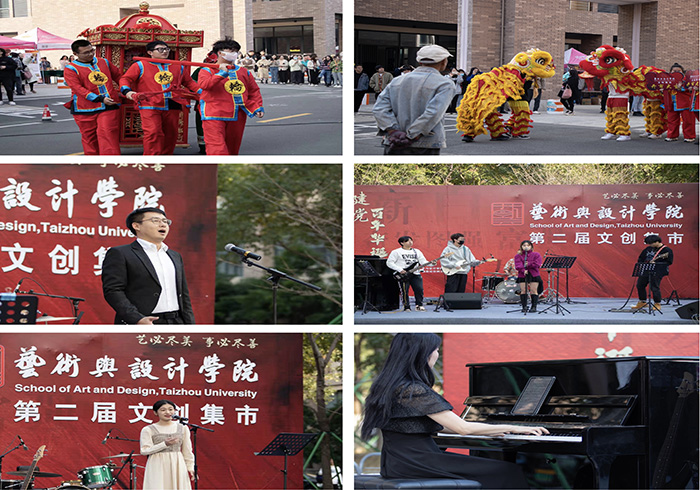 此次文创集市开幕式上,临海非物质文化遗产传统婚俗礼仪走进校园,同学参与表演,整体气氛喜庆欢乐,吸引了许多同学,在欢声笑语中大家学习了传统礼仪文化。青椒1139乐队,嘉宾老师陈浏行、何萍和员工郑舟影、黄舒欣为此次活动带来了精彩表演。