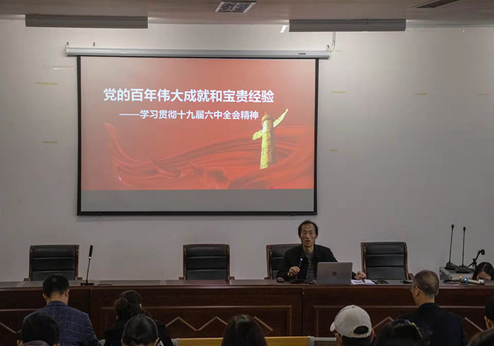 张伟指出,通过学习,全体师生要进一步了解了十九届六中全会的主要精神与核心要义,做到学史明理、学史增信、学史崇德、学史力行。在新的征程上,增强“四个意识”,坚定“四个自信”,做到“两个维护”。深刻认识中国共产党为什么“能”,马克思主义为什么“行”,中国特色社会主义为什么“好”。全体教师要凝心聚力,将党史学习与实际工作结合起来,为文化强国与美丽中国建设贡献自己的力量。勿忘昨天的苦难辉煌,无愧今天的使命担当,以史为鉴、开创未来,埋头苦干、勇毅前行,为实现第二个百年奋斗目标、实现中华民族伟大复兴的中国梦而不懈奋斗。