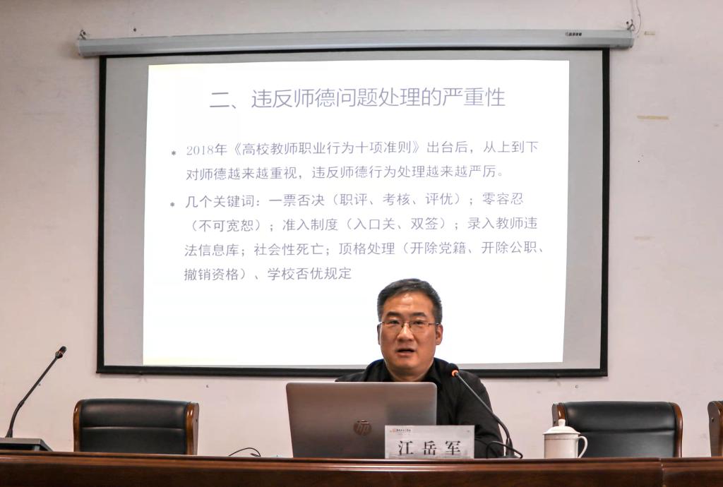 江岳军从广义及狭义两个方面阐述了师德的含义,并运用鲜活的例子进一步强调违反师德问题的严重性。他指出近年来,党中央对师德师风建设高度重视。公司成立党委教师工作部,将加强教师思想建设、推进师德专题教育作为重点工作。而后他对《新时代高校教师职业行为十项准则》进行了详细解读,从“学术不端行为”“不当言论行为”和“发生不当关系”三个方面结合准则做了具体的案例分享。