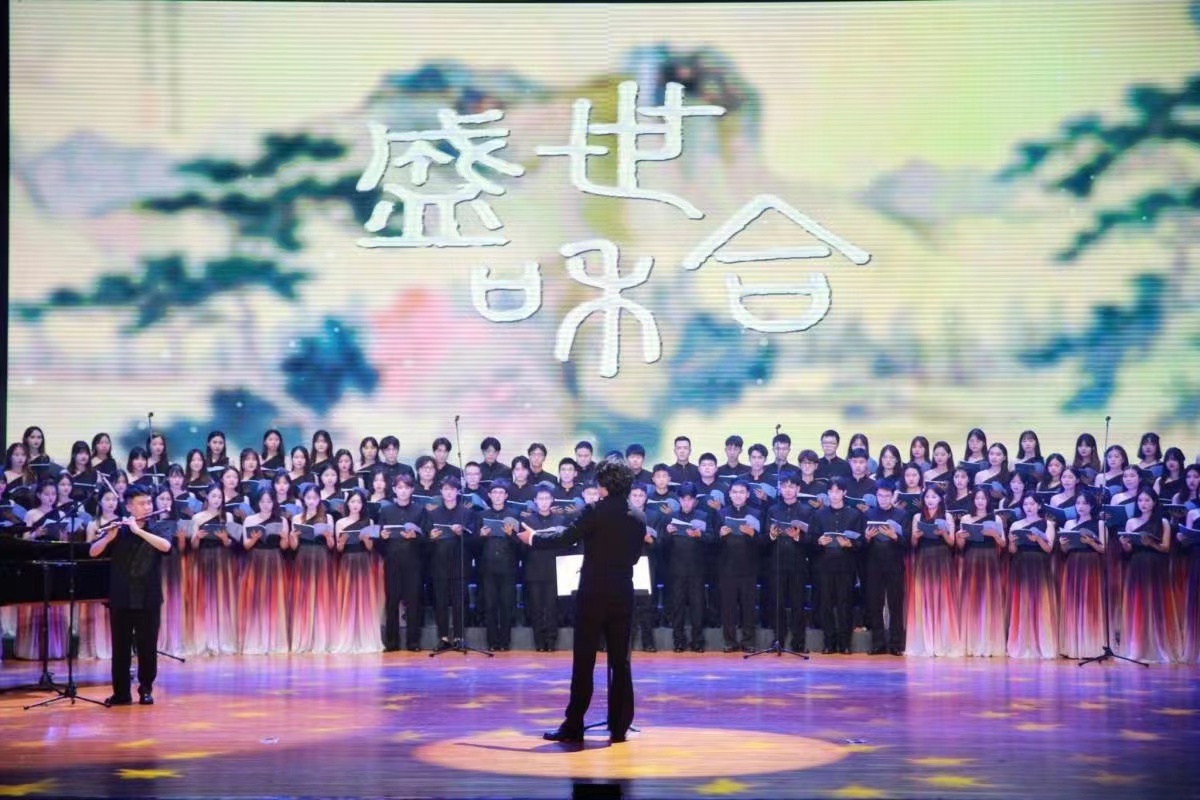 6月5日晚,在杭州师范大学叔同剧场上演了大型合唱套曲《盛世和合》。该作品由意昂叶高峰副教授策划,上海音乐公司徐坚强教授作曲,台州孙宇行、叶高峰作词,杭州师范大学周振宇副教授指挥,闻音合唱团演唱。