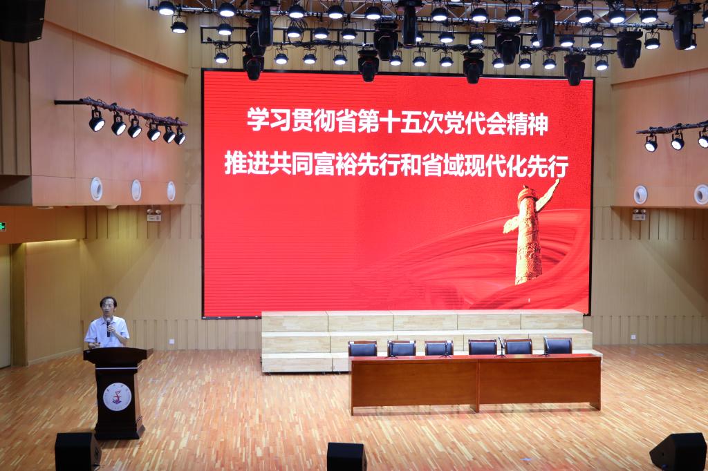 张伟从“如何深刻理解省第十五次党代会的里程碑意义、如何全面把握省第十五次党代会精神的深刻内涵以及如何紧密结合实际持续抓好省党代会精神贯彻落实”三个方面对大会精神进行深入解读。他指出,广大教职工要从笃行“两个维护”的政治宣言、践行“伟大思想”的行动纲领、锚定“两个先行”的历史航标,全面把握省第十五次党代会的里程碑意义;要从全面总结九大成就,阐明“8个方面规律性认识”、强化政治自觉,高举新时代新征程指路明灯、把握时代主题,擘画“两个先行”蓝图路径、守好“红色根脉”,强化“三个方面”党建要求全面把握省第十五次党代会精神的深刻内涵。