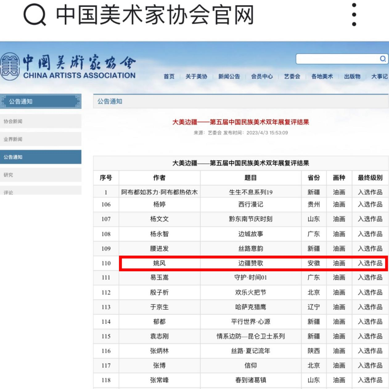 中国美术家协会、新疆维吾尔自治区文学艺术界联合会将在乌鲁木齐市举办“第五届中国民族美术双年展”,展览以“大美边疆”为主题,描绘新时代各民族社会风貌,弘扬民族优秀文化,展示中国民族美术的新面貌、新特点,增强民族团结,彰显民族自信,推进边疆地区美术事业发展。“大美边疆——第五届中国民族美术双年展”会成为当下民族美术创作的有力助推。姚风老师曾多次深入边疆民族地区,立足于当下民族地区的文化传统和生活现实,从深层次去理解民族精神,进而发现社会转型过程中民族地区生活和观念所发生的变化,在作品《边疆赞歌》中表现出当代中国边疆民族的精神面貌,展览入选分值为3分。