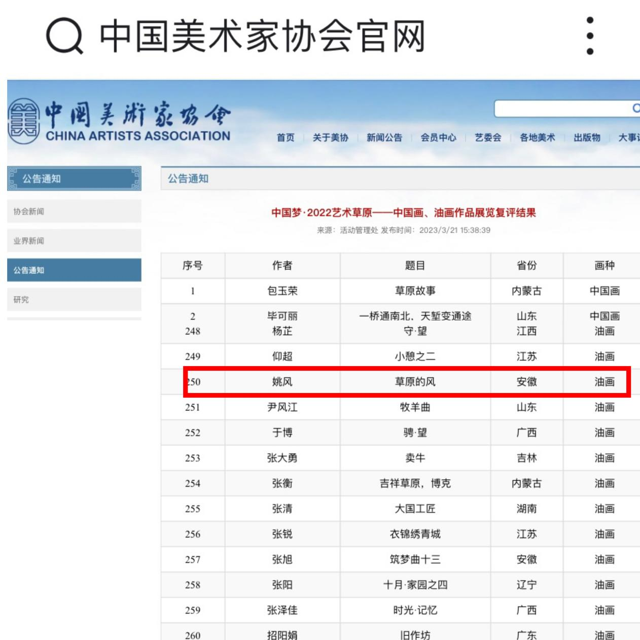 由中国美术家协会、中国文学艺术基金会、内蒙古自治区文化和旅游厅、九三学社内蒙古自治区委员会、内蒙古自治区政协书画院举办的“中国梦·2022艺术草原——中国画、油画作品展览”复评结果于近日公布,姚风作品《草原的风》有幸入选。
