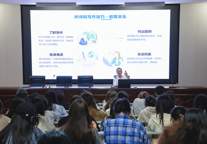金柔雅从新闻的基本理论知识入手,为学员们讲解了新闻导语、新闻主体、新闻背景的撰写要点并结合具体案例阐述了不同类型新闻的写作技巧,并指出新闻撰写要突出重点,条理清晰,把握新闻的真实性与实效性;她还就“如何做好新闻摄影”进行了讲解,指出新闻摄影构图最主要的目的是揭示新闻信息的内容,只有做到这一点,才能产生最佳的传播效果。