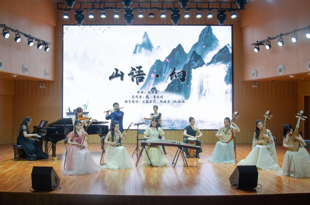 温柔的琴声流淌入耳,无处安放的思念融入歌声,音乐会在《教我如何不想她》的深情告白中拉开序幕。《晚秋》展现了秋日的寂寥,琵琶长音与泛音的夹杂,时而清脆动听,时而激扬愤慨,交织着无奈与不甘。钢琴舒缓流畅,《我的深情为你守候》唱出了对祖国细腻、坚贞的爱;而领航》通过四重唱,凸显激昂澎湃情感。一把二胡,两种氛围,《风居住的街道》曲调婉转悠扬。《阳光照耀着塔什库尔干》曲风辽阔,感受到草原上奔放豪迈的风土人情;《肖斯塔科维奇》小提琴二重奏搭配着钢琴和音,以其独特的音乐色彩使人耳目一新。《幽兰操》、《更漏子·玉炉香》通过对古典诗词的再创作,更添典雅古韵。音乐会在“镜·音”民乐团的空灵演奏中进入尾声,管弦丝竹合奏涟漪如画,台下掌声浪潮般此起彼伏。