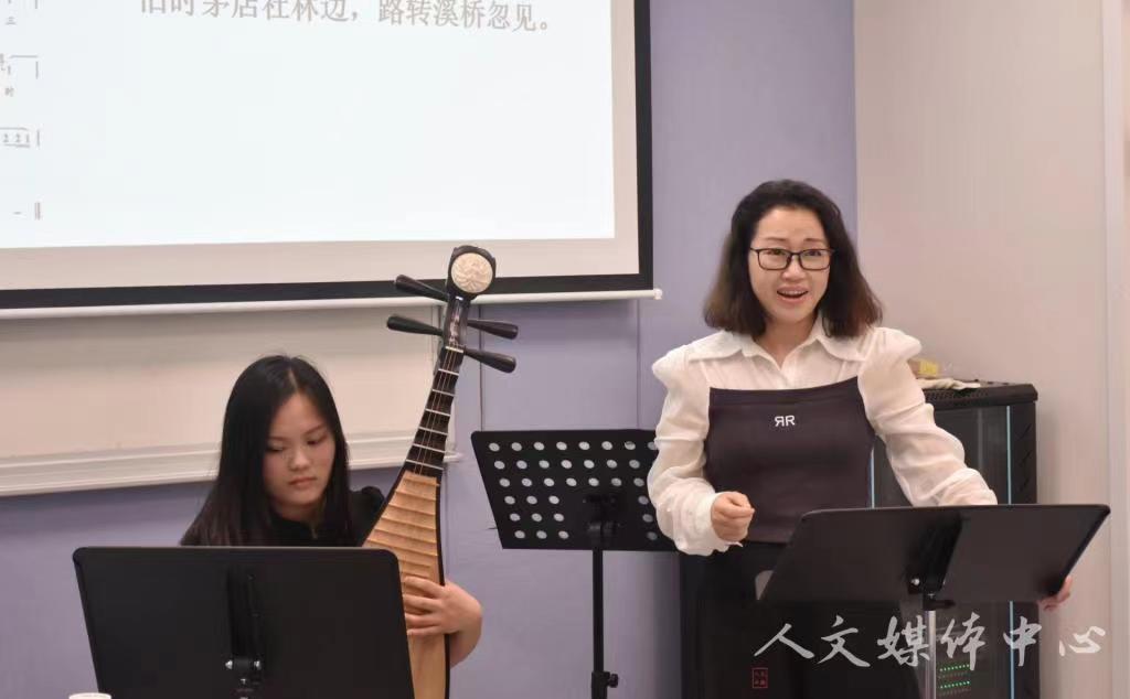 随后,为了让同学们深刻感受诗词的演唱方式和技巧,孔春恒和何金龙两位老师现场合作了《送元二使安西》。孔老师演唱技巧高超,歌声雄壮浑厚,使人身临其境。何老师使用笛子合奏,笛声悲昂,烘托了现场氛围。二位老师高超的演奏技术令现场观众仿佛真的置身那场离别之中。