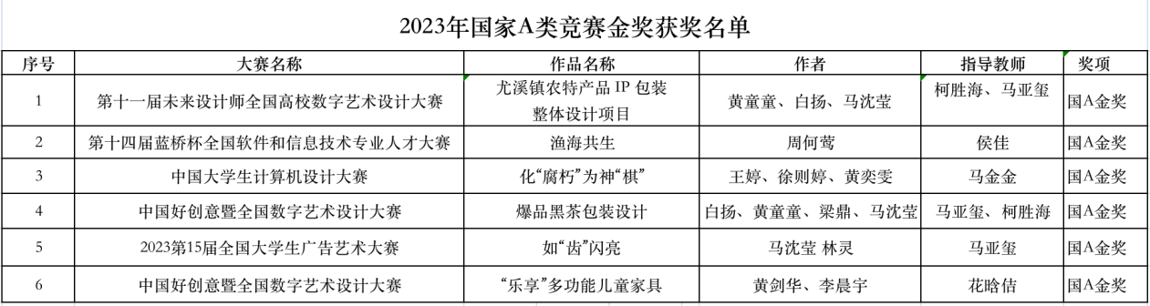 近日,各类国赛相继落下帷幕,艺术公司师生团队获国赛A类金奖项目共有6项,是公司在学科竞赛国赛项目上取得的重大突破。具体获奖情况如下: