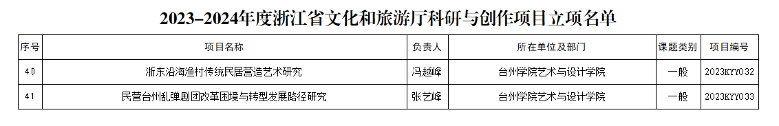 9月20日,浙江省文化和旅游厅发布《浙江省文化和旅游厅关于2023-2024年度厅级科研与创作项目拟立项名单的公示》,公司冯越峰、张艺峰教师申报的项目《浙东沿海渔村传统民居营造艺术研究》、《民营台州乱弹剧团改革困境与转型发展路径研究》获得立项。