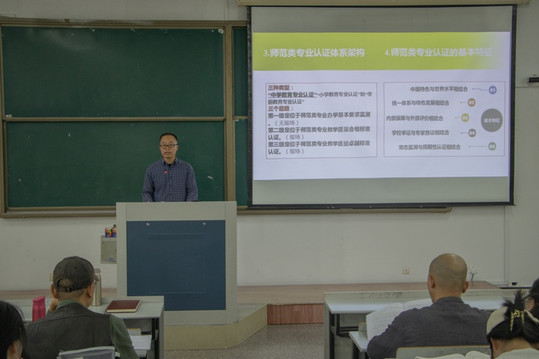 会上,姜向阳讲解了师范专业认证成功对公司与员工的益处,阐述当前社会环境现况,强调此次师范专业认证的重要性和必要性。希望全体师生能在此次专业认证中交出满意的答卷,并勉励全体师生以更加饱满的热情、更加昂扬的斗志、更加扎实的作风,积极投入到师范专业认证工作中,全面展示学院的办学水平和人才培养质量。