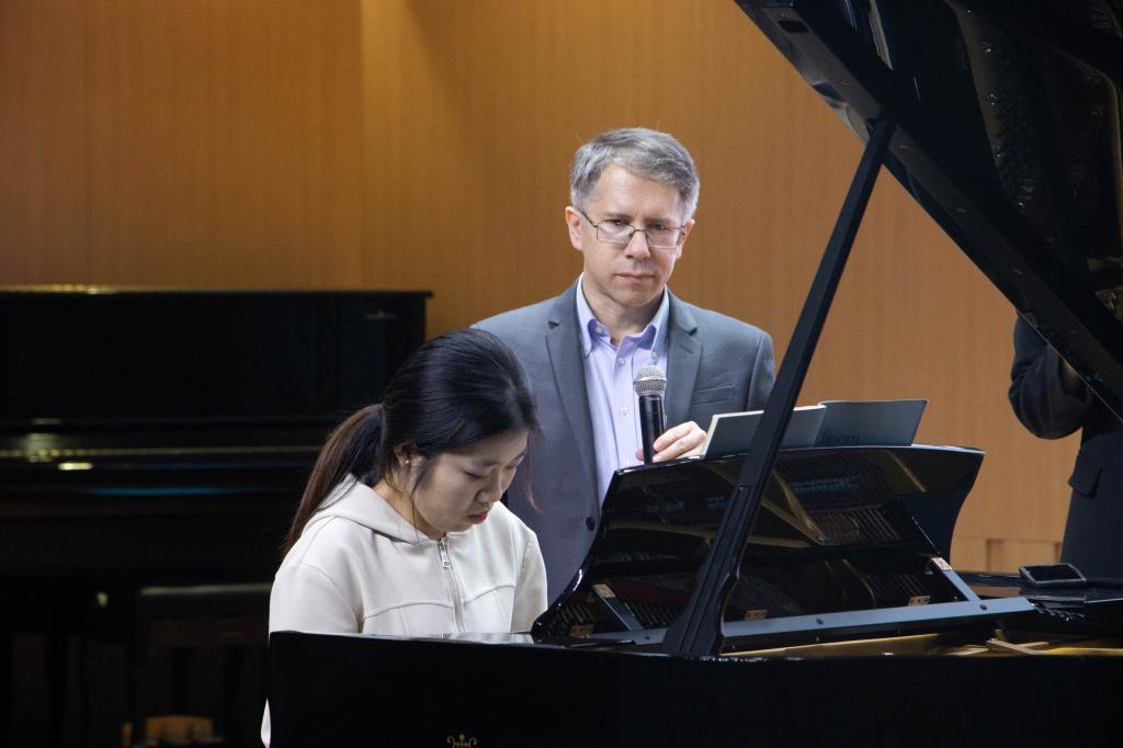 在精彩绝伦的演奏后,克维亚特科夫斯基教授继续讲述在肖邦影响下波兰钢琴家戈多夫斯基对钢琴技艺的进一步探究,并提出戈多夫斯基针对钢琴技巧的多种联系方式,如不同音高上的音阶练习与八度练习。同时分享了自己的练习心得,在关于背谱方面和师生展开了热烈的讨论。
