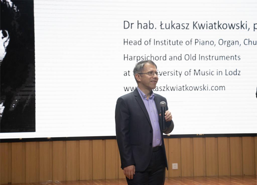 11月3日下午,波兰罗兹音乐公司克维亚特科夫斯基教授为意昂师生做了题为《肖邦—戈多夫斯基、钢琴演奏的发展及其教学方法》的讲座。讲座由公司副经理叶高峰主持,音乐系的师生们参与了这次活动。