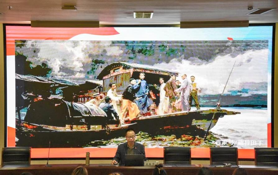 赵振华以“丹青写春秋,百年风华正茂”为主题,用经典的美术党史作品,再现了中国共产党百年历程以来的光辉历程,从艺术角度着重介绍了《启航》《五四运动》《唤起工农千百万》《井冈山会师》四幅作品,以画为体、以史为魂、生动的描述了中国共产党史。他阐述了建党初期的艰辛探索历程、军队建设、军风整顿等内容,同时点明了朱毛会师后新道路的出现是星星之火,亦可燎原,让入党积极分子进一步感受到了党史的波澜壮阔。