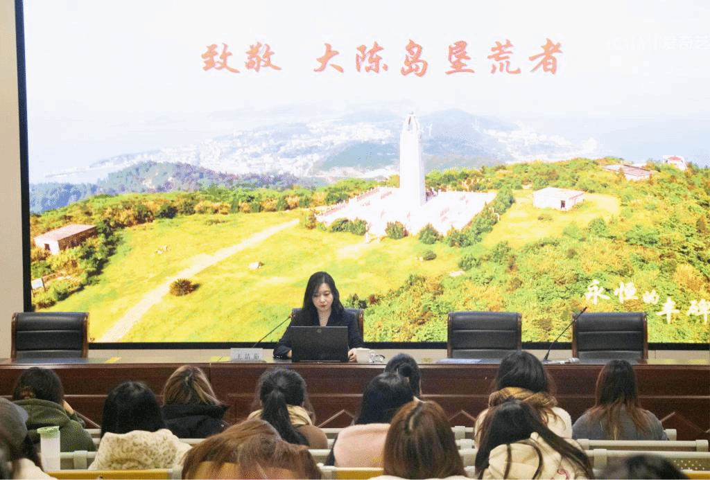 王洁茹以“垦荒精神不老”为主题,从垦荒背景、赴岛视察、信件往来等多方面为切入点,讲述了大陈岛经过代代垦荒人的不懈奋战,从荒芜到胜景的艰苦历程。她强调大陈岛是习近平总书记给予关心关切和重要嘱托的红色岛屿,更是铸就了以“艰苦奋斗、奋发图强、无私奉献、开拓创新”为核心的垦荒精神,同时引导大家要不断成长、争做新时代的"垦荒者"。