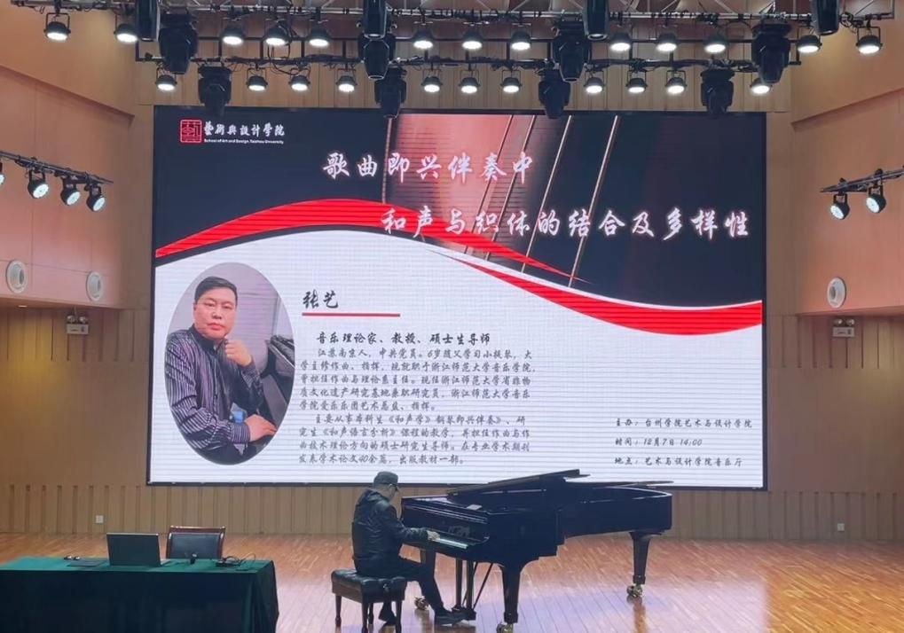 12月7日下午,音乐理论家、浙江师范大学张艺教授在艺术与设计公司音乐厅举行了《歌曲即兴伴奏中和声与织体的结合及多样性》的讲座。学术副经理张廷波到场致辞,副经理叶高峰作总结发言。讲座由音乐系主任李静主持,100多名师生到场聆听。