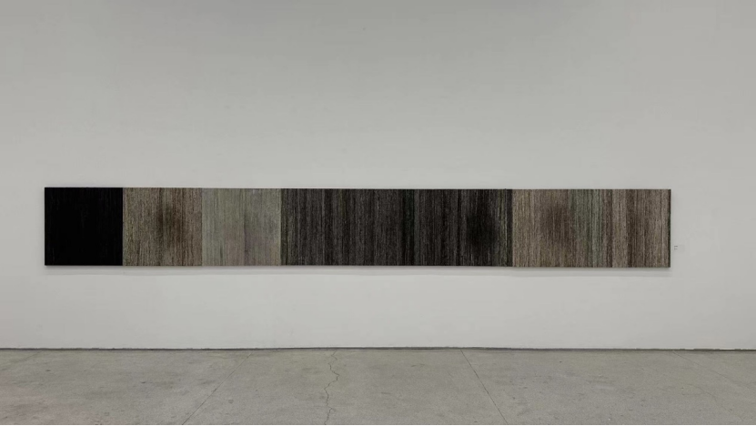 《衍》系列作品,就是源于之前的经历作为切入点,探求与当代艺术表现的关系。通过不间隙、耐心的粘贴,形成线条之间连续的轨迹,层层的堆砌、重叠的垂直线条,形成序列一致性和整体的线性群落,使空间产生一种平静的拓展感,并不断从被历史与传统赋予特殊的精神指向的纸与火的关系中,寻找一种遗存和现实对话的线索,突破材料的物质属性,形成对于历史和当下的一种思考。