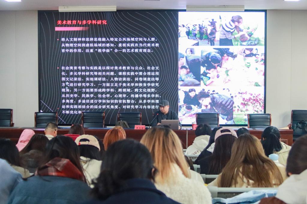 李凡璠分享了美育考察实践与调研方法,探讨实践对教学的影响并分析当代美育发展方向及多学科与美术教育的融合。他着重指出,在现代教学过程中,实践环节的关键作用不容忽视,论述了技术进步与艺术领域的交汇点,凸显了艺术与教育创新的重要性和紧迫性。