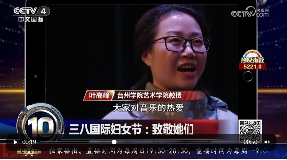 近日,公司叶高峰教授及其带领的天台女子合唱团接受了浙江卫视的专题采访,并于3月8日在浙江卫视首播,3月9日在央视4套(中文国际频道)播出。