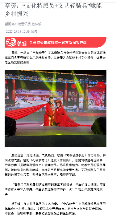 据悉,未来,亭旁镇将继续以“宁和赤子”文艺轻骑兵为纽带,与高校开展更多元化的合作,让文艺之花在乡村大地绚烂绽放,持续为乡村文化振兴注入新活力。