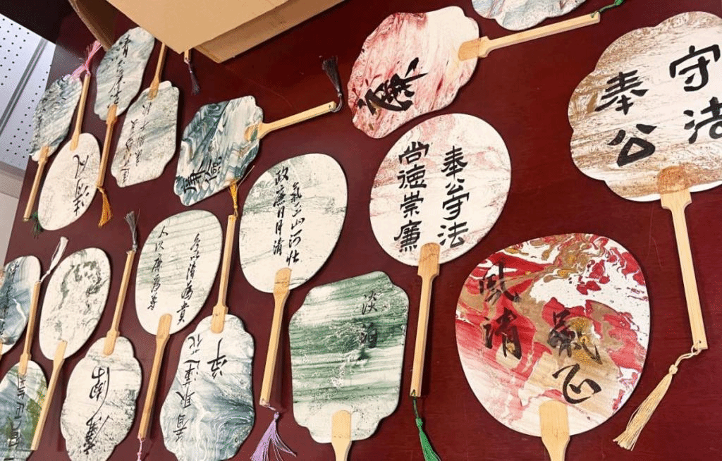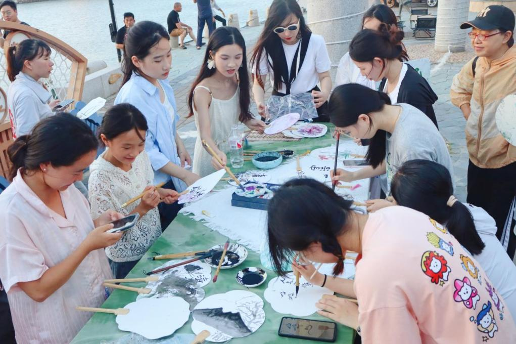 在大陈镇党群中心和梅花湾广场,实践队发挥专业优势,开展多场“艺路清风”非遗廉扇制作体验活动。活动现场人气火爆,男女老幼济济一堂。美术专业员工们介绍了大漆的历史及文化内涵,手把手教当地渔民和游客如何制作廉洁漆扇,题写清廉寄语,创作廉洁主题扇面。看着自己亲手制作的漆扇逐渐成形,大家喜不自胜,纷纷拿起漆扇作品相互欣赏、交流,拍照留念。参加活动的渔民项爱琴表示:“我采了三十多年的贻贝,从没想过自己能画出这么好看的扇子。这个活动太有意义了,我想给老伴、侄女都做一把!”二百多把漆扇,经参与者们亲手绘制后成了“清风扇”,被当地居民和游客领取一空,大家在体验非遗文化和廉洁文化的同时,感受到艺术创作实践带来的乐趣。